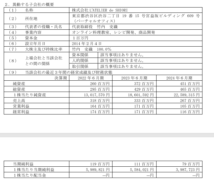 株式会社L’ATELIER de SHIORIの株式の取得(子会社化)に関するお知らせ