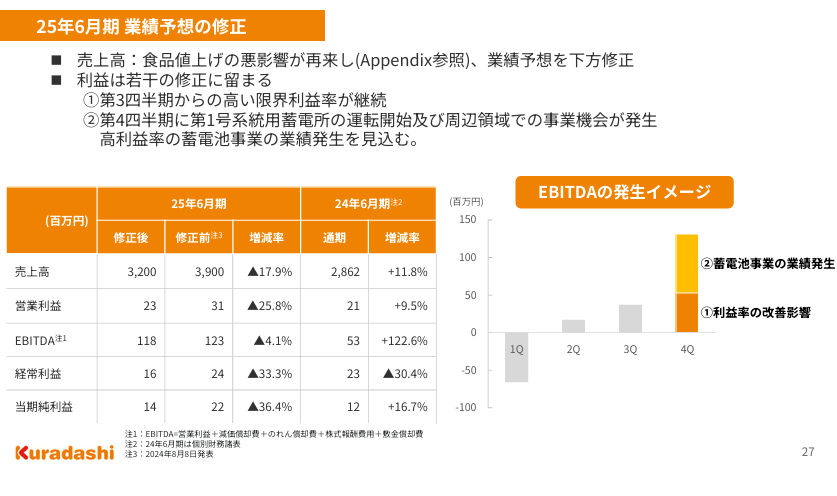 Kuradashi自体の成長、在庫クリアランスの完了、つるかめキッチンのフル寄与(前期は約10か月分)、系統用蓄電池のフル寄与、La Table de SHIORIのいきなりフル寄与を考えると、3.5~4.5億円くらいはありそうです。